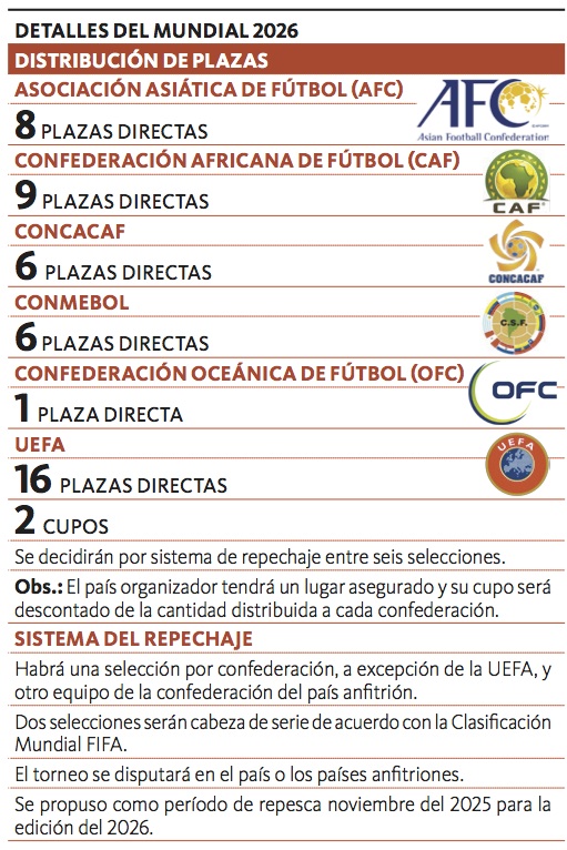En el caso de la Concacaf (América del Norte, Central y Caribe), el aumento de cupos sería todavía mayor, ya que actualmente tiene 3,5 y elevaría la cuenta 2,5, también para tener 6.