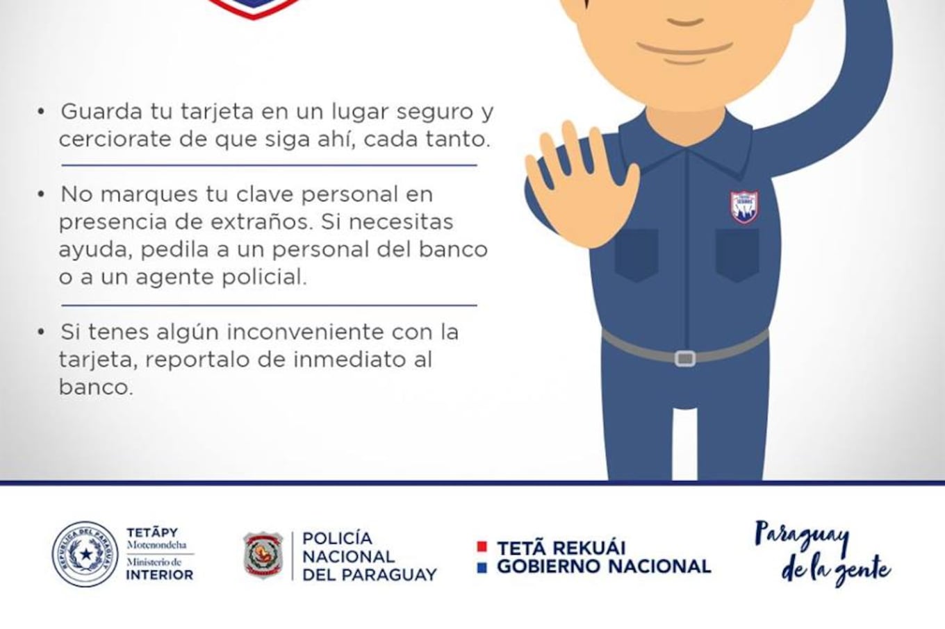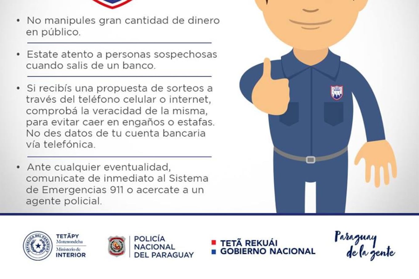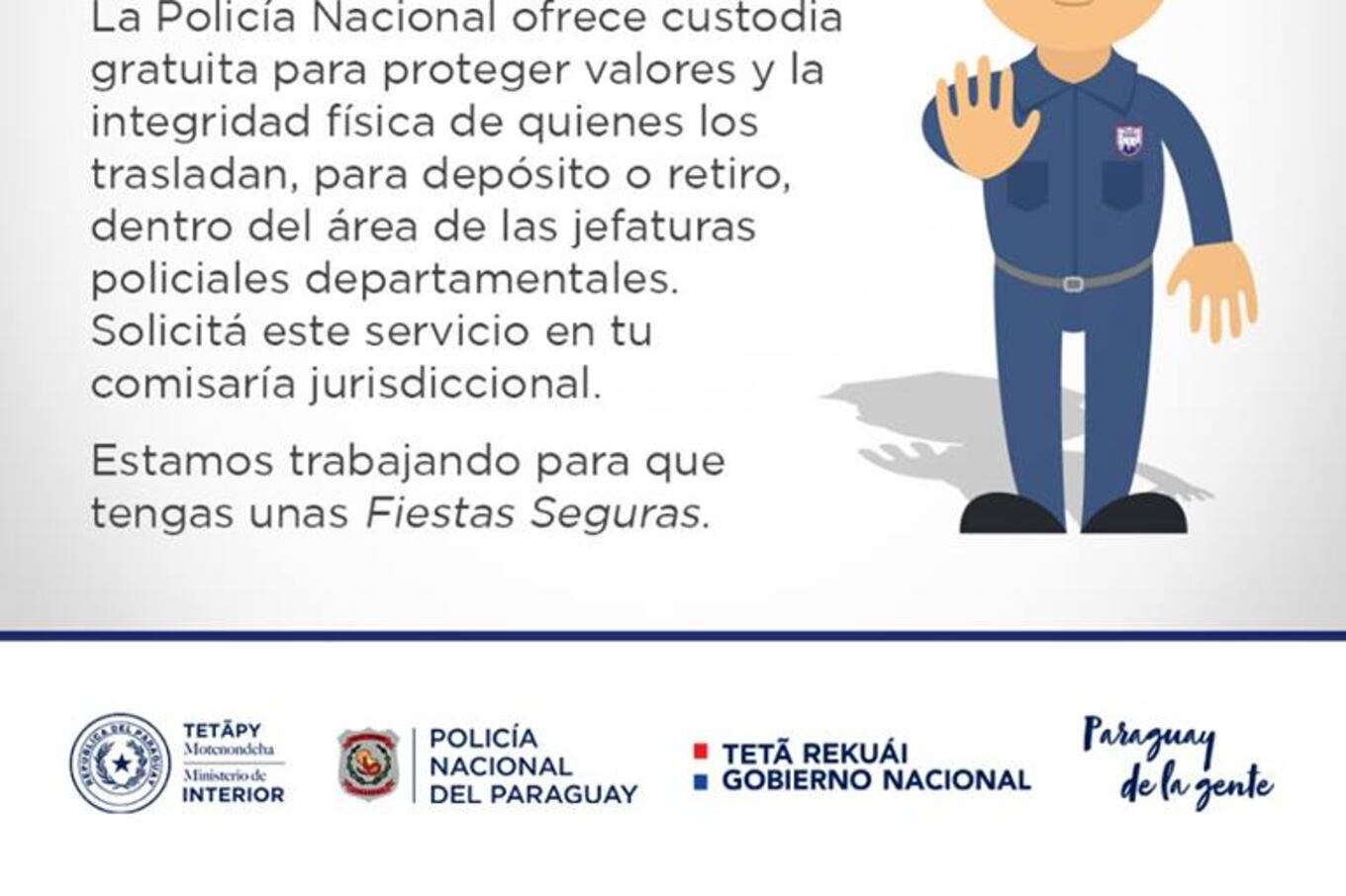 “La Policía Nacional, en su misión de resguardar la vida, la seguridad e integridad de las personas, ofrece custodia gratuita para proteger valores y la integridad física de las personas que realizan los traslados ya sea para depósito o retiro, dentro del área de las jefaturas policiales departamentales”, dice parte de un comunicado.