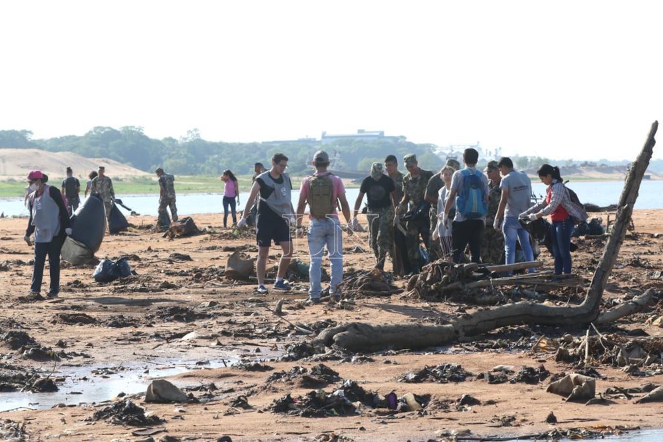 Pobladores y voluntarios de la Comisión Ribera Limpia realizan éste sábado un intenso trabajo de limpieza del Río de Paraguay, en la zona de San Antonio. Debido a la gran bajante de las aguas y la excesiva sequía de esta temporada, salieron a flote una gran cantidad de basuras, lo que a simple vista deja visualizar la falta de conciencia ciudadana.